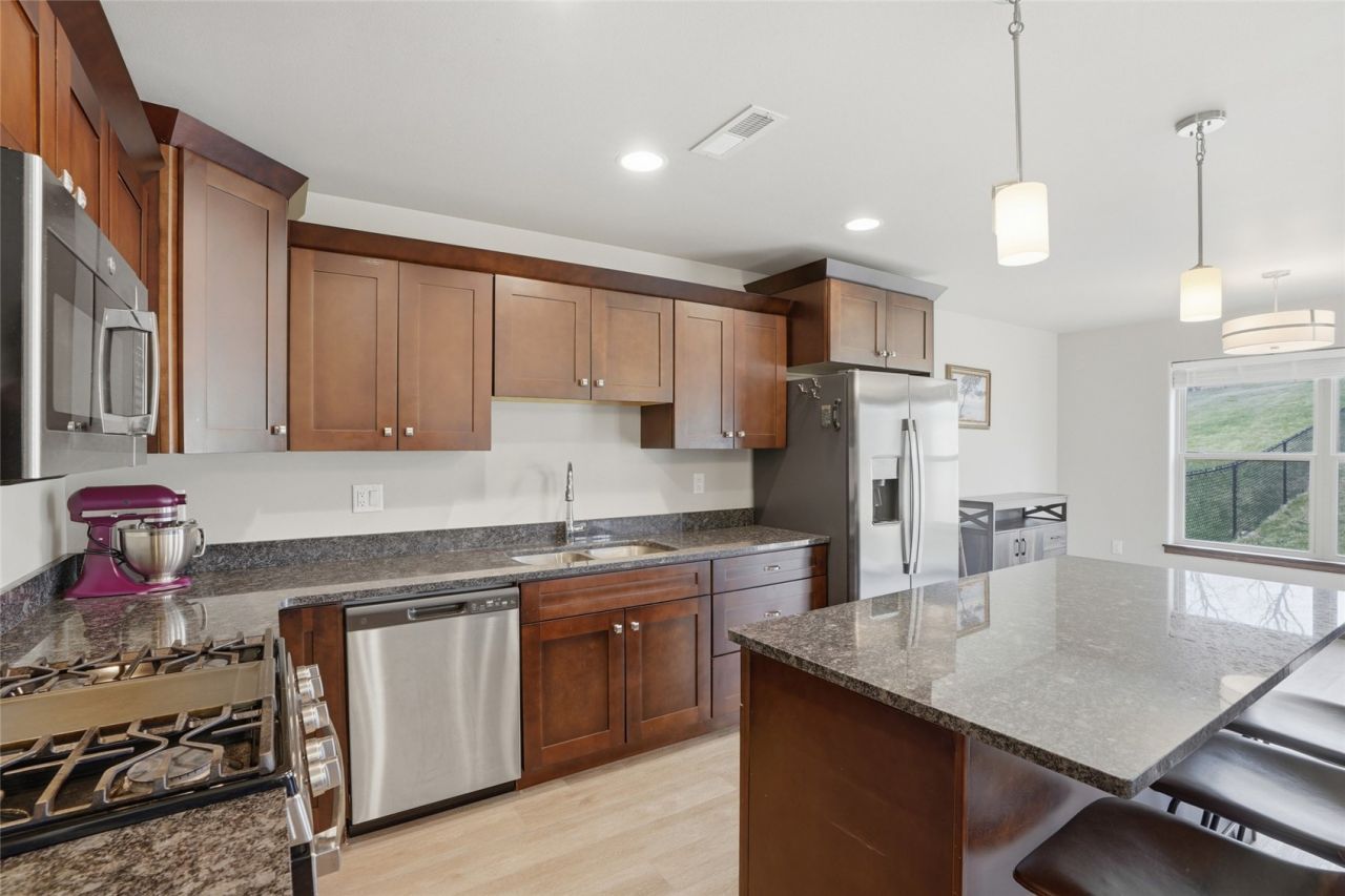 This spacious contemporary home features upgraded finishes, a large open living area with cozy fireplace, sizeable light filled kitchen with glowing granite counter tops, massive island, dining area that leads out to your own private patio overlooking the back yard and so much more. The upper level has a serene primary suite with large walk in closet, a bonus storage room, two guest bedrooms and a good sized guest bath. This home is perfect for entertaining your family and friends. Relocation riders apply